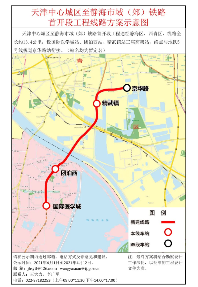 天津中心城区至静海市域(郊)铁路首开段工程途经静海区、西青区,线路全长约13.4公里,设国际医学城站、团泊西站、精武镇站三座高架站(站名均为暂定名),终点与地铁5号线规划京华路站衔接。