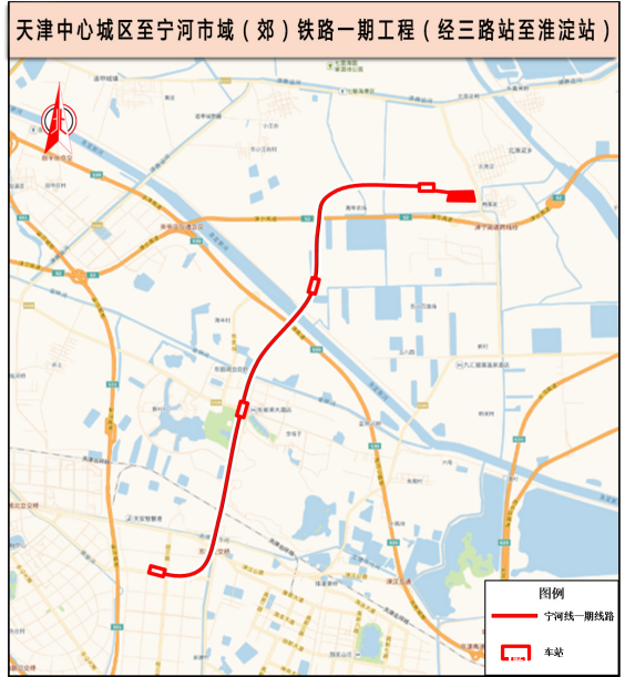 按照规划方案,津宁市域郊铁路全长约49.5公里,设站七座,起于宁河城区,经宁河经济开发区、七里海镇、北淮淀镇、未来科技城、东丽湖至空港经济区,宁河城区站点设置正在研究完善中。