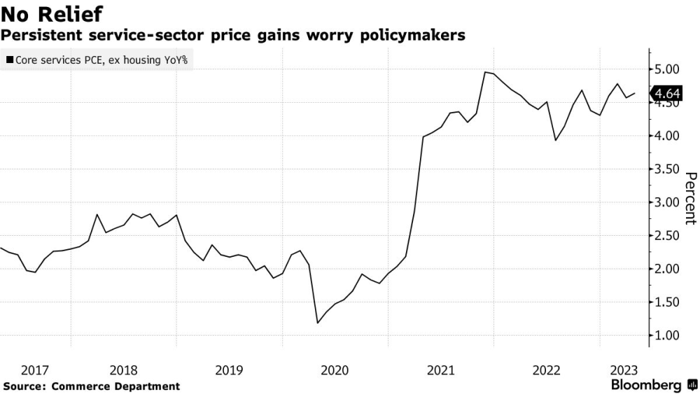 数据显示,美联储首选的通胀指标——个人消费支出价格指数(PCE)4月份环比上涨0.4%,高于预期,同比上涨4.4%,是美联储目标的两倍多。此外,美联储主席鲍威尔强调的剔除住房的核心PCE 4月份上升0.42%,为时隔两个月再度回升,创下自今年年初以来最大幅度的月度涨幅。